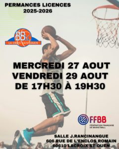 Permanences licences au Basket-ball La Croix mercredi 27 août de 17h30 à 19h30, salle J. Rancinangue à La Croix Saint-Ouen.