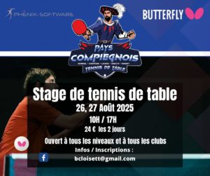 Le Pays compiégnois tennis de table organise un stage mardi 26 et mercredi 27 août, de 10 heures à 17 heures, gymnase Ferdinand Bac à Compiègne