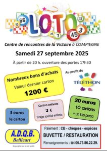 L'ADQB organise un loto au profit du Téléthon samedi 27 septembre à partir de 20 heures, Centre des rencontres de la victoire, rue Saint-Joseph à Compiègne