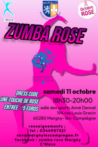 Zumba rose à Margny samedi 11 octobre, de 18h30 à 20 heures, salle Aimé Dennel à Margny-lès-Compiègne. Dress code : une touche de rose