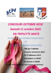 Association sportive pétanque Venette organise un concours Octobre rose samedi 11 octobre à partir de 112h30, terrain de pétanque François Louvet à Venette