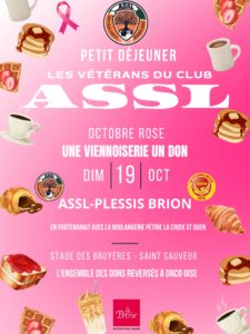 L'ASSL reçoit l'US Plessis Brion dimanche 19 octobre à 10 heures, stade des bruyères à Saint-Sauveur. Une vente de viennoiseries au profit d'Octobre rose aura lieu ce dimanche matin.