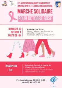 Dans le cadre d'Octobre rose, Margny sports et loisirs organise une marche solidaire dimanche 19 octobre. Rendez-vous à 10 heures, parc de la mairie de Margny.