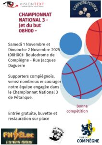 Championnat national 3 avec Compiègne pétanque club samedi 1er et dimanche 2 novembre, dès 8 heures, au boulodrome de Compiègne, rue Jacques Daguerre.
