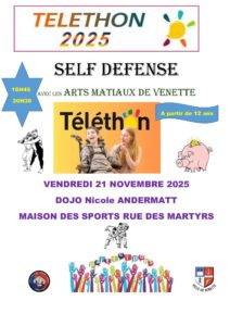 Dans le cadre du Téléthon, le Judo jujitsu de Venette organise une initiation au self-défense vendredi 21 novembre de 18h45 à 0h30, maison des sports de Venette