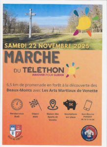 Le Judo jujitsu de Venette organise une marche dans le cadre du Téléthon, samedi 22 novembre. Rendez-vous à 8h45 à la maison des sports de Venette.