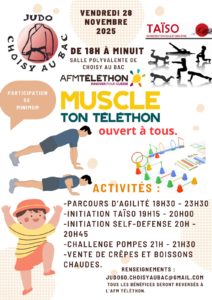 Muscle ton Téléthon avec le Judo Choisy vendredi 28 novembre de 18 heures à minuit, salle polyvalente de Choisy-au-Bac.