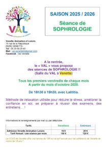 Venette animation et loisirs propose une séance de sophrologie vendredi 5 décembre de 18h30 à 19h30, salle du VAL (derrière la mairie) à Venette.