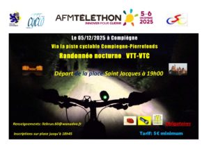 Le Compiègne sports cyclistes organise, dans le cadre du Téléthon, une randonnée nocturne VTT-VTC vendredi 5 décembre à 19 heures, place Saint-Jacques à Compiègne